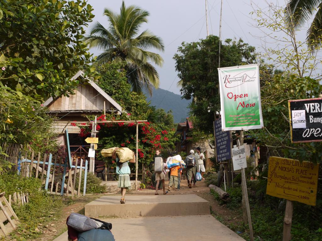 It takes three hours by minibus to the village of Nong Khiaw northeast of Luang Prabang, and another hour in one of the narrow, long Laotian boats up the Nam Ou river, to reach Muang Ngoi. The river is winding its way through densely forested mountains with steep rock faces.