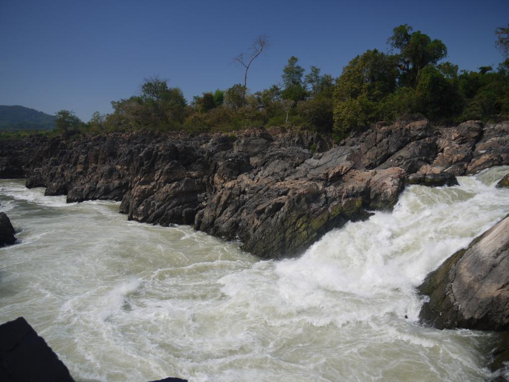 Next I went all the way to the southern end of Don Khon, where I found a small beach jutting out between the main flow of the Mekong and a rapidly flowing side channel that has washed out a quiet pool. Went swimming for a while. It’s impossible to swim against the current – even long-tail boats slow to a crawl – but approaching sideways from the pool and grabbing a root while the water rushes past is fun. Although I have travelled on the Mekong before, I have never swum in it before. Southern Laos is hot and sunny but not humid, and the water is quite warm. Not bad for the last day of November.